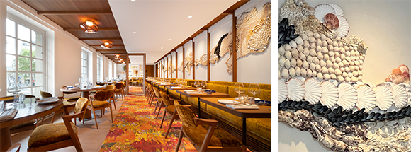 インテリアはAgence Costaに託された。1階は花崗岩の長いカウンターが実に見事。ここで白ワインとフリュイ・ドゥ・メールの盛り合わせで、シンプルに魚介を味わうのもよさそう、と思わせるデザインだ。カウンターの向かいのテーブル席は、赤系の布とブルーのテーブルが不思議なカラーマッチで目を楽しませる。2階に上がると、なんといっても見逃せないのは壁を飾るヴィクトワール・フォンテーヌによる貝のフレスコ画。ブルターニュ地方のさまざまな島にはそれぞれ固有の貝があり、複数の島からの貝が壁画の中で豊かな色彩を広げている。海がなんだか身近に感じられる店内、季節の魚料理を味わう楽しい時間をヴィーヴで!