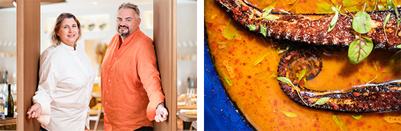 左: ステファニー&ダヴィッド・ル=ケレック photo:Antoine Marceau 右: 人気のタコ料理。かすかにハリッサを利かせたソースがタコの味を引き立てる。89ユーロ(ハーフ59ユーロ)