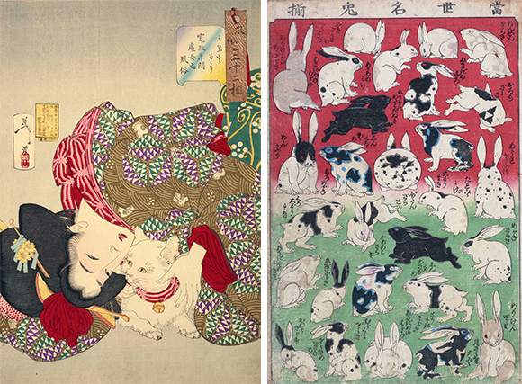 左: 展覧会のポスターから。きれいに身繕いされ、見事な首輪をした猫。飼い主の若い娘から大切にされている様子が見てとれる。1888年。 右: 江戸時代初期に描かれたウサギ。 collection du Edo-Tokyo Museum