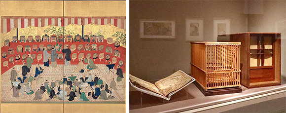 左: 江戸時代中頃の屏風。ウズラの歌声コンクールが描かれている。collection du Edo-Tokyo Museum 右: ウズラのカゴも展示。photo:Mariko Omura