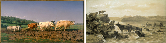 左: 1849年のサロンで大成功を収めた『Labourage nivernais, dit aussi Le sombrage』(1849年)。©Musée d’Orsay, Dist. RMN-Grand Palais / Patrice Schmidt  右: 会場で大勢を吸い寄せる木炭画は、スコットランドで描いた『Bœufs traversant un lac devant Ballachulish (Ecosse) ou Troupeau traversant une rivière』(1867、1873年)© DR
