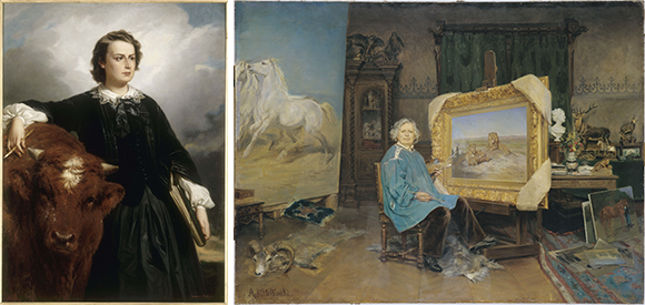 左: Édouard-Louis Dubufe(1819〜83)によるローザ・ボヌールの肖像画。牛はローザの筆による。制作は1857年、彼女が35歳の時だ。© RMN-Grand Palais (Château de Versailles) / photo Gérard Blot. 右: George Achille-Fould(1865〜1951)による『アトリエのローザ・ボヌール』(1893年)。亡くなる6年前、71歳の時。© Mairie de Bordeaux, musée des Beaux-Arts, photo L. Gauthier