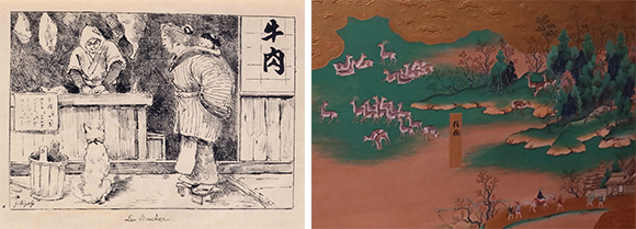 左: 鎖国が終わり来日した外国人を驚かせたのは、日本における動物と人間の友好関係。フランス人画家ビゴーが描いた作品『Le bonheur』(1883年)に見られるように、追い払われることもなく、肉屋の前でおこぼれをいただけるのをおとなしく待っている犬の光景もそのひとつだった。 右: 1634年頃に3代将軍家光のために描かれたといわれる「江戸図屏風」の中に、この時代の人々と動物の関係を見いだせる。動物で最も多く登場するのは軍馬だが、近づいてみると、板橋と書かれた土地には野生の鹿の姿も多数。photos:(左)collection du Edo-Tokyo Museum、(右)Mariko Omura