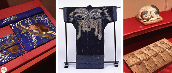 左: 猿を刺繍したタバコ入れ。 中: 白鳥を刺繍したかい巻き布団(19世紀)。 右: 猫の蚊取り線香焚き(1926〜1945年)photos:(左、右)Mariko Omura、(中)collection du Edo-Tokyo Muséum