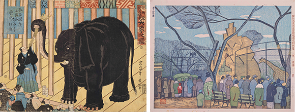 左: 象、虎、ラクダなど海外からの動物は珍しさゆえに集客力のある見世物となった。Ryôko, 1863 collection du Edo-Tokyo Museum 右: 明治時代以降には動物園、水族館が東京に開設された。小泉癸巳男が東京を描いた100点の中から、48番目の『春の動物園』(1934年)。 collection du Edo-Tokyo Museum