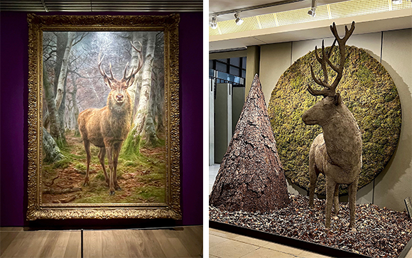 左: ローザ・ボヌール作『森の王』(1878年)。244.4×175cmという巨大な作品は、森の中で大鹿にばったり遭遇したイメージで鑑賞! 右: 展覧会場の向かいに、アーチストのグロリア・フリードマンによるインスタレーションが。 photos Mariko Omura