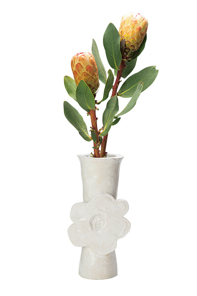 世界中の美しい手仕事を紹介しているショップ、ワウ・ラ・ターブルがセレクトするのは、ポルトガルの有名陶芸家ベラ・シルヴァが手がけた花器。おおらかさが魅力のポルトガルの伝統的な陶器は、パリジェンヌにもなじみ深いもの。凹凸ある不均一なフォルムに大きな花が目を惹くユニークなデザインだが、透明感あふれる白色で凛とした雰囲気も醸し出す。Φ9×H26cm 152ユーロ