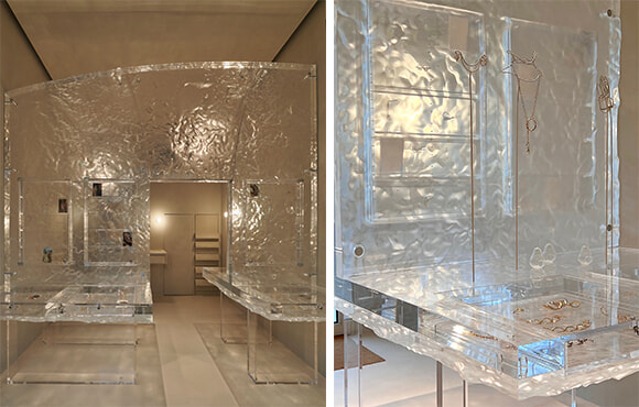 この新しい空間も右岸店同様に室内建築をコラボレーションしたのはオランダのAnne Holtropで、フォルムと素材の仕事の続きが見られる。小さなスペース内、まるで流れ落ちる水が凝結したような印象を与える一枚岩の透明のアーチが圧巻だ。その左右の下部に設えられた透明のケース内にジュエリーをディスプレー。シャルロットのジュエリーを収めるのに似つかわしいモダンな店内はエントランスのガラス扉の奥にクリアに姿を見せ、サンジェルマン大通りを歩く人に視覚的な強い思い出をプレゼントするかのようだ。