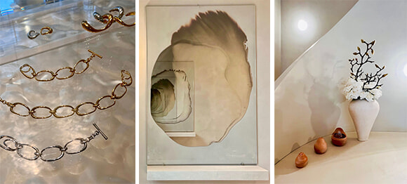 左: シャルロット・シェネのタイムレスなジュエリーは2015年以来世界中の女性たちを魅了し続けている。 中: スウェーデンをベースにするデザイナーJenny Nordbergの鏡。ふたつが向かい合わせに配置され、無限に続く。 右: 昨春、ブティックの工事が始まる前にこのスペースでコラボレーションを行ったフローリストCastorによるブーケと、木製のジュエリーボックス。photos:Mariko Omura