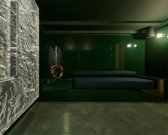 アーチをくぐって上階のコンフィデンシャル・フロアへと。ここはハイジュエリーのための空間で、翡翠色のラッカー仕上げの壁、モスグリーンの厚手の絨毯にベンチ席という70年代調でまとめられた。地上階の明るさとコントラストをなすように、こちらは照明が落とされた深い静寂の世界。その中で氷のブロックに閉じ込められたようなジュエリーが貴石を輝かせている。