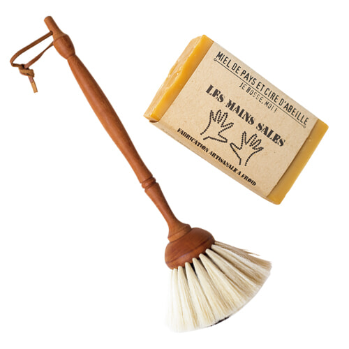 フランス・オーヴェルニュ地方の女性が手がけるソープは8ユーロ。天然成分を生かすため加熱しない製法で作る。真っ白な山羊毛のブラシは35ユーロ。ドイツの老舗メーカー、レデッカー製で、黒い山羊毛のワンポイントがお気に入り。