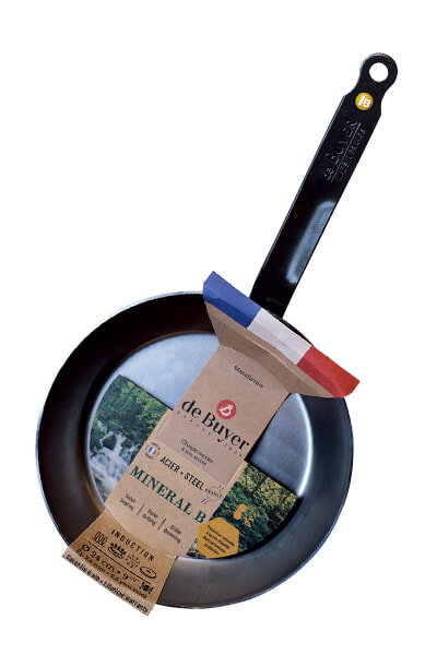 一生ものの鉄のフライパン(φ24㎝)は50ユーロ。おすすめは1830年から続くデバイヤーのもの。