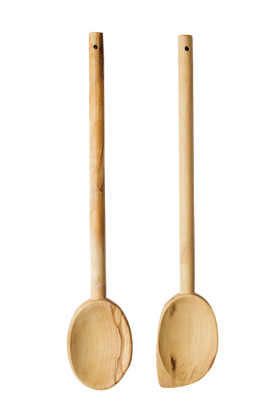 エストニア産、頑丈なオリーブの木の調理用スプーンは7ユーロ。黒い木目が好まれるため、捨てられてしまう白い部分を使用。