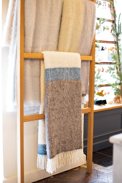 モヘアのひざ掛けは288ユーロ。1806年から8代続く南仏プロヴァンスのブラン・ドゥ・ヴィアン=ティランのもの。アザミの実で起毛しているので表面がふんわり柔らかい。
