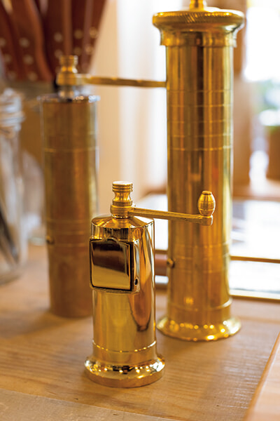 ギリシャのブランド、アレクサンダー・ミル製の真鍮のペッパーミルは84ユーロ。インダストリアルなデザインも秀逸だ。
