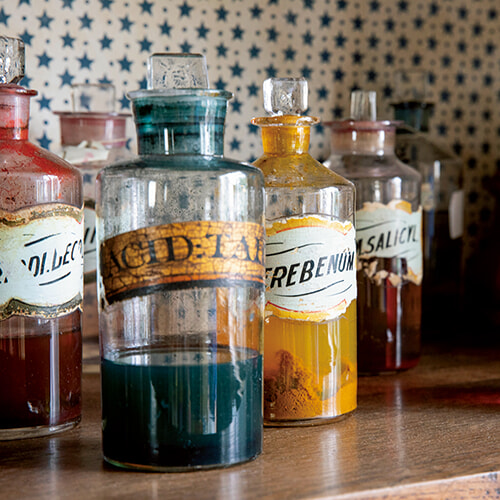 古い薬瓶に入った顔料も、色調のインスピレーション源になる。