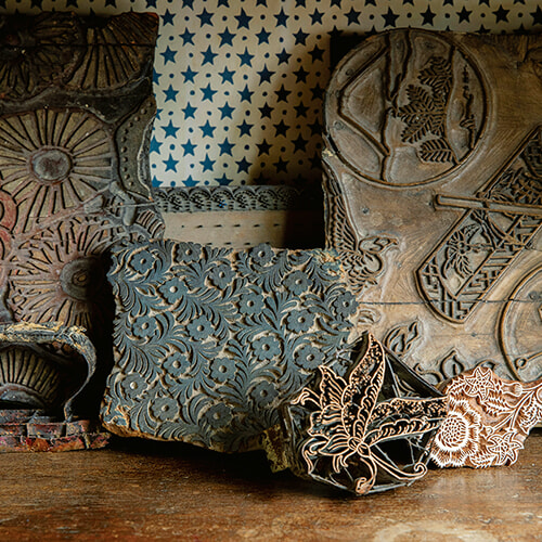 インスピレーション源は、蚤の市やオークションで発掘する18〜19世紀の玩具や雑貨、装飾品。棚には古の木版のコレクションが並ぶ。