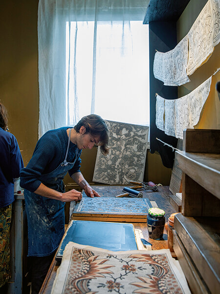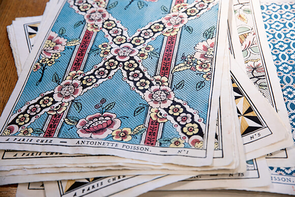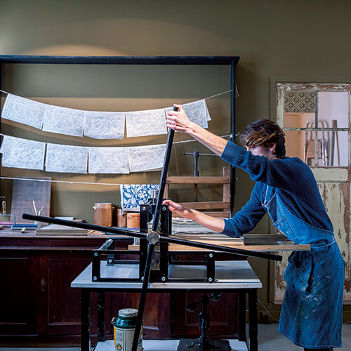 メートル・ダールの称号を持つ職人がフランス・シャラント県で作る麻繊維の紙は、透かしで制作日とマークが入っている極上の品。その紙を濡らし、丁寧にインクをのせた金属製の版材に置いて、印刷機にセットする。大きな取っ手を手で回し、手のひらで優しく撫で上げて、一枚ずつ擦り上げてゆく様子は、まるで時が止まったかのよう。ポショワールの手法で行われる色付けでは、図案によっては最大6枚もの型紙を使って色が重ねられ、フリーハンドで仕上げる部分もある。全工程が手作業なだけに、微妙な版ずれや濃淡の差があって、それがまた美しい。
