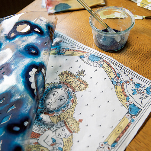 ポショワールの手法で色付け。「子どもを抱くマドンナ」にブルーをのせたところ。型紙をそっと外して。
