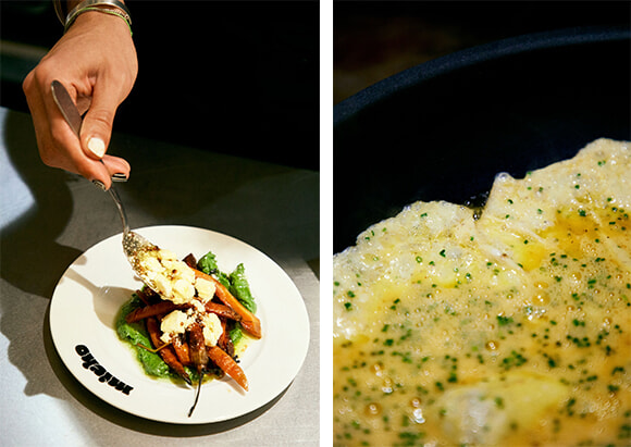 夜はプチビストロに変身するミショー。その一端はランチタイムのサイドとして味わえる。サイドの「イエロー」(5.5ユーロ)はニンニク味のジャガイモ、「オレンジ」(6.5ユーロ)は味噌&ペストソースのカラフル・ニンジン、「パープル」(6.5ユーロ)はラディッキオにヤギチーズのクリームだ。