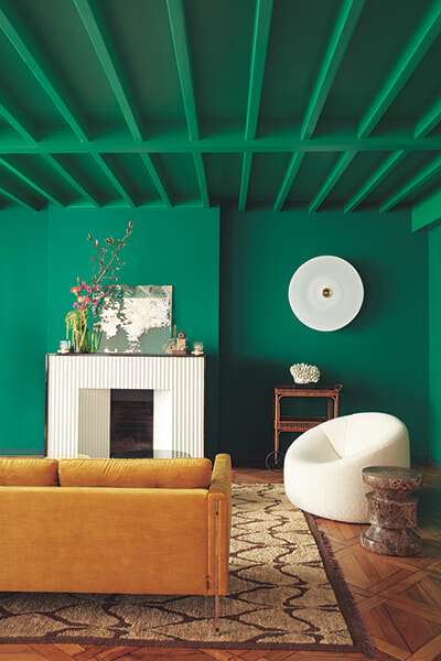 この部屋には3つのグリーンが共存。エメラルドグリーンの壁はマット感が強く、幅木は光沢のあるフォレストグリーン。天井はやや黄色がかった光沢のあるグリーンで、いずれもルスルス社の顔料を使用。右に置かれたピエール・ポランのパンプキンアームチェアや奥に置かれるランプシェードも白でまとめて、色彩のコントラストを演出。