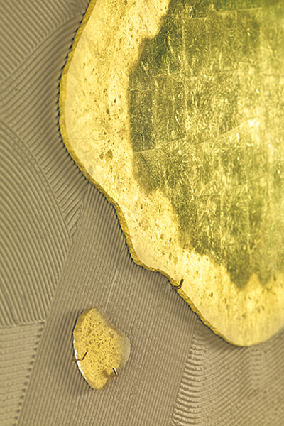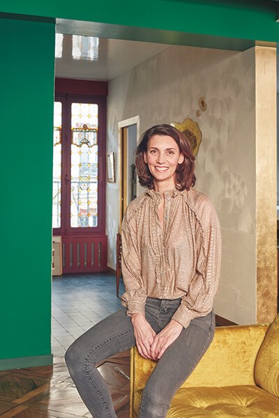 フレスコ画の手法を得意とするアトリエで、インテリアデザインから壁面装飾の注文までをこなしていたソレーヌ。現在進行中の壁面装飾のプロジェクトでも、ヨーロッパの伝統的な手法にこだわっているという。自宅も同様で、「ベースとなるのは伝統的な手法です。そのうえで過去と現在が融合したような、素朴なのに凝った風合いに仕上げます。塗装はざらざら感や光沢感などコントラストを効かせることも好き。ほとんどが未加工の素材に、あえてゴールドをぶつけてみるのもいいですね」。加えて、ミネラル感や、自然からインスピレーションを得た絵柄など、フレスコ画と共通している要素を、現代の家の造りに応用している点がとても知的だ。