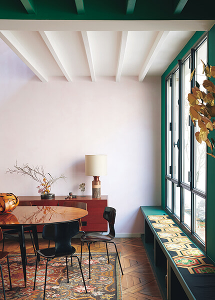明るいダイニングスペースは緑のリビングの真向かい。壁は、シクラメンの花のように繊細なペールピンクで、ルスルス社の白い塗料の上に着色を施し、まるで古代ローマの壁のように柔らかな色合いとなめらかさ、マット感を出した。