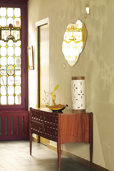 エントランスから続く空間の壁面に、フランスのインテリアデザイナー、ジャン=ミシェル・フランクへのオマージュを込めて、ソレーヌは櫛引きコテを使い、壁一面に模様を刻んだ。アールデコ調の洗練された幾何学模様の扉から光が差すこの明るい空間から、前ページのグリーンのサロンへと続いていく。ガラスや鏡など、光を受け止める素材で作られたオブジェもソレーヌが手がけたもの。「フラック(水たまり)」と名付けられた21金の箔加飾を施したガラス作品だ。光が溶け込むアートも、ソレーヌの家に独特な風合いを与える大切な要素である。