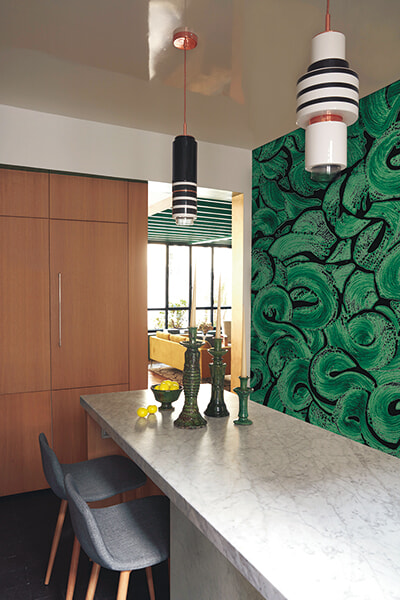 ギャラリー・ヴォクレールのためにソレーヌがデザインした壁紙「ルムー(渦)」を使用したキッチン。色とモチーフは、温室を描いた19世紀末の何枚かの古生地に着想を得たそう。