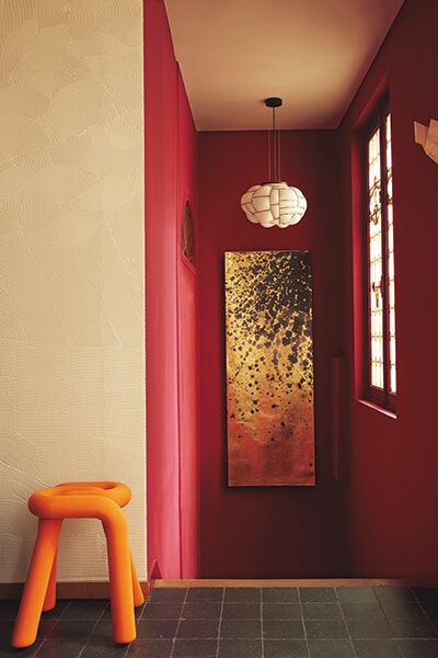 エントランスは深い赤。ソレーヌの原画をもとにゴールドの銅箔を使って手作業した「星座」と名付けられた壁紙が掛け軸のように飾られている。左の手前に置かれたスツールは、ムスターシュのボールド。