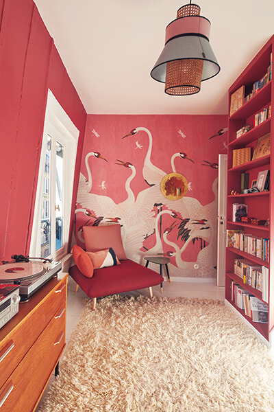 ソレーヌの娘のフロールが自らセレクトした、グッチのツルが描かれた壁紙を一面に。残りの壁と戸棚の扉は同じ色合いの濃いピンクにペイント。天井や窓枠は白く塗って明るい印象に。レトロなオーディオの趣味はかえって現代っ子ぽい。