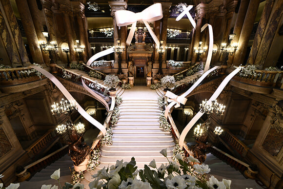 2月21日、オペラ・ガルニエはピンクのリボンと白い花で優美に飾られた。photo:Virgile Guinard