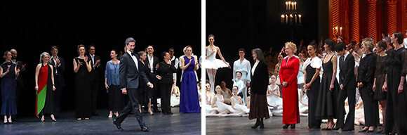 左: 長老クロード・ベッシーの後に登場した芸術監督のジョゼ・マルティネス。後方に並ぶのはエレオノーラ・アバニャート、フランソワ・アリュ、クレールマリ・オスタ、カール・パケット、アニエス・ルテステュ、エルヴェ・モロー、ローラン・イレールたち。右: ドミニク・カルフーニ、クロード・ド・ヴュルピアン、ルディック・モディエール、イザベル・ゲラン、マリー=クロード・ピエトラガラ、キャロル・アルボ、レティシア・ピュジョル、マリ=アニエス・ジロ。彼女たちの後列には、ニコラ・ル・リッシュ、マニュエル・ルグリが。photos:Mariko Omura