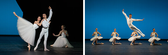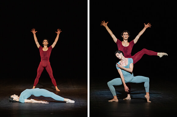左: ヴァランティーヌ・コラサントとポール・マルク。 右: スター性を発揮したギヨーム・ディオップ。この晩『Vaslaw』でプルミエ・ダンスールのオードリック・ブザールが踊ったソロを、翌日の公演ではギヨームが踊っている。パリ・オペラ座の期待の星だ。photos:Jonathan Kellerman/Opéra national de Paris