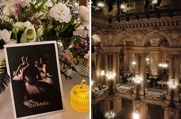 ガラのスポンサーはChanel(シャネル@chanelofficial)とRolex(ロレックス@rolex)。 舞台終了後、白をメインにした花々が装飾されたグラン・フォワイエでディナーが開催された。photos:(左)Mariko Omura、(右)Virgile Guinard