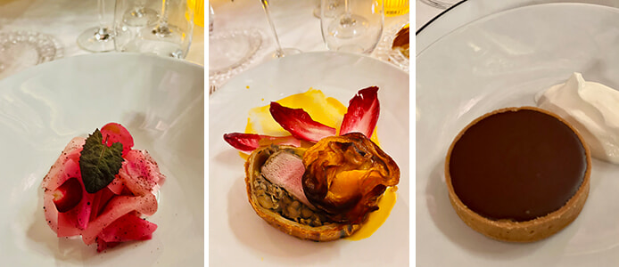 左: 前菜。ビーツの極薄スライスはローズオイルと花弁でバラが香り立つ。 中: メインは仔牛のウエリントン(写真)またはかぼちゃの花。 右: デザート。驚くほど軽いチョコレートタルト。photos:Mariko Omura