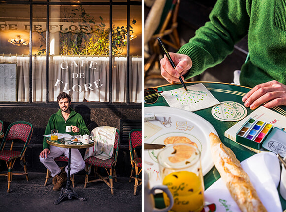「カフェ・ド・フロールなくして、パリはパリにあらず」。こう語ったのは、イラストレーター&クリエイターのMarin Montagut(マラン・モンタギュ)。彼の夢のひとつはそのカフェ・ド・フロールを描くことで、その夢を叶えたところなのだ。インスタグラムで彼をフォローしている人には、彼がこのコラボレーションに興奮している様子を3月13日の販売開始前に感じていただろう。