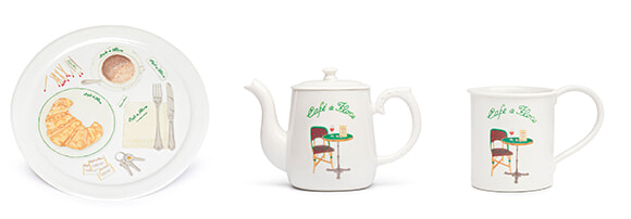 カフェ・ド・フロールと彼のコラボレーションで、いちばんの注目はセラミックのお盆とティーポットである。カフェで使われているのは銀器だが、その実物の型をとっているので素材は異なれど、見た瞬間にカフェ・ド・フロールが目に浮かぶ。お盆にはカフェやクロワッサンがのっている光景が騙し絵的に描かれ、ティーポットにはテラス席でおなじみの丸い緑色のビストロテーブルとビストロチェアが描かれている。そのモチーフはティーカップや皿、小皿にも描かれているが、こちらはマラン・モンタギュのオリジナルの型だ。またこのモチーフは、カフェのメニューにインスパイアされたスケッチ帳のカバーにも。最後のページにはカフェのホットドリンクのメニューが載っていて……なかなかいいお土産になりそうだ。