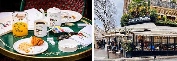 左: おなじみグリーンのビストロテーブル。マラン・モンタギュ×カフェ・ド・フロールのお皿、グラス、ナプキンなど。マグカップは3サイズある。 右: 1887年の開業以来、サンジェルマン大通り172番地で人気を集めているカフェ・ド・フロール。『エミリー、パリへ行く』効果で、朝から店の前に席待ちの長い行列が!! photos:(左)Romain Ricard、(右)Mariko Omura