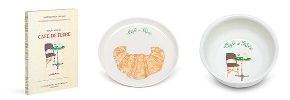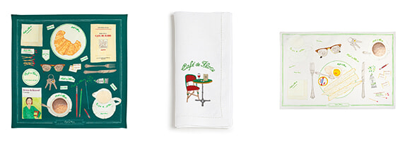 このほか彼の水彩が生かされたランチョンマット、グラス。そしてシルクのスカーフも。ここにはクロワッサンやカフェに加えて、シモーヌ・ド・ボーヴォワールの文庫本も。これは彼女が生涯の伴侶だったサルトルとふたり、カフェ・ド・フロールの常連であったことから。彼らをはじめ、ここは実存主義者たちが戦後大勢集まったという、ちょっとした歴史もデッサンにこめられている。カプセルコレクションはマラン・モンタギュのブティックとサイトにて、限定販売中。