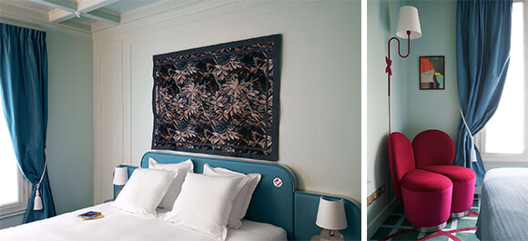 クラシックな壁のタペストリーとポップな家具が共存する客室。130ユーロ〜。photos:©Romain Courtemanche