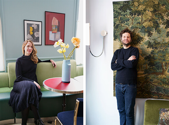 オテル・ビアンヴニュに続いてコラボレーションをした室内装飾家のChloé Nègle(クロエ・ネーグル、左)とTouristeのAdrien Gloaguen(アドリアン・グロアゲン)。photos:©Romain Courtemanche