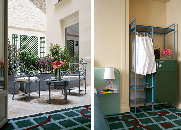 左: 地上階のテラスつきの部屋。 右: クローゼットはどの客室もオープンスタイルだ。photos:©Romain Courtemanche
