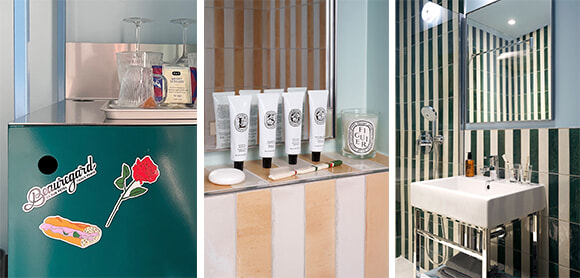 左: ステッカーが部屋にポップをプラス。 中・右: バスルーム。ディプティックのアメニティににっこり! ストライプはダニエル・ビュランの仕事がクロエのインスピレーション源。photos:(左)Mariko Omura、(中・右)©Romain Courtemanche