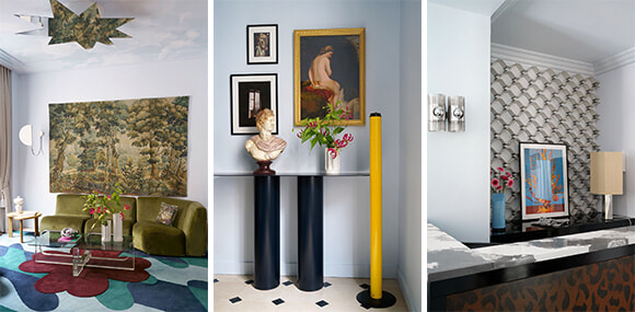 30歳の若い女性が亡くなったお祖母様の家を引き継いだら?というイメージをもとにインテリア作りは進められたそうだ。昔から家に飾られている壁のタペストリーや棚の胸像といったインテリアの要素をいくつか守りつつ、ピエール・ポラン風の家具などポップな味わいをプラスして……と。掘り出したヴィンテージの家具、クロエがデザインした家具など70年代気分がミックスされている。ロビーそして客室の壁のいかにもクラシックなタペストリーは時代ものではなく、昔ながらのモチーフなどを取り入れてPinton(パントン)の新しい工場で機械織りされたものだ。アート作品はAmélie Maison d’Art(アメリー、メゾン・ダール)によるセレクションである。