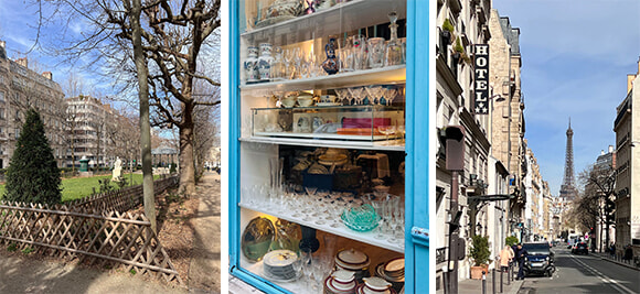 左: 地下鉄Vaugirard駅。住宅街らしく、駅前公園には大勢の子どもとシッターたち、老人たちが。 中: ホテルのすぐ近くに気になるブロカント店が。 右: ホテルのあるペテル通りに入ると、にょきっとエッフェル塔が姿を現す。なお、オテル・ボールギャールは4ツ星だけど、かつて3ツ星時代だった名残りの看板が見える。photos:Mariko Omura