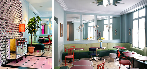 左: 70年代のメタルの間仕切りを壁の装飾に。エントランスのピンク色のガラス扉が空間に明るい色を跳ね返す。 右: 朝食ルーム。一日中カフェ的にも宿泊客は利用できる。photos:(左)Mariko Omura、(右)©Romain Courtemanche