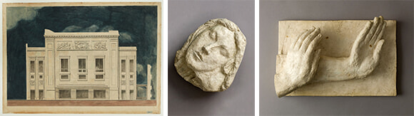 オーギュスト・ペレの設計で知られる、1913年に落成したモンテーニュ通りのシャンゼリゼ劇場。ブールデルも建築に参加し、ファサードには浅浮彫りを、劇場内には『狩人に追われて』と題したフレスコ画を制作した。左: 劇場のファサードのデッサン。習作の12作目にあたる。 中: 『Danse, masque d’Isadora』。舞踏家イサドラ・ダンカンの石膏の頭部はファサードのレリーフのための習作。ブールデルは過去にイサドラ・ダンカンの舞台を見た際に、彼女の舞踏に衝撃を受けている。 右: 『Danse, Les mains d’Isadora』。イサドラ・ダンカンの両手。これも劇場のためのレリーフの習作だ。©︎ Musée Bourdelle/ Paris Musées