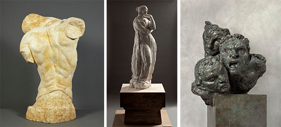 左: 等身大の『Centaure mourant(瀕死のケンタウロス)』(1914年)。photo:Stéphane Piéra/ Musée Bourdelle/ Paris Musées 中: 『Pénélope』(1909年)。photo:Stéphane Piéra/ Musée Bourdelle/ Paris Musées 右: 『la Guerre ou Trois Têtes hurlantes(戦争あるいは叫ぶ3つの顔)』(1870-1871. 1894-1899)。photo:©︎Eric Emo/ Musée Bourdelle /Paris Musées