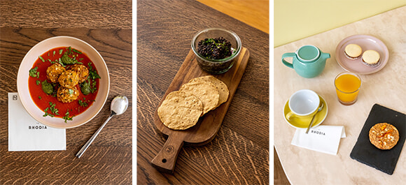 ル・ロディアの食と空間のコンセプトは、パリ9区に南米料理のレストラン「ISANA」を開いたジャン=ルネ・シャシニョルによるものだ。彼は室内建築をスタジオSAMEとコラボレーションし、50年代の椅子とSAMEがデザインした家具がミックスされた、自宅風の居心地よい雰囲気が漂うレストランを作り上げた。近郊の季節の素材ですべてが手作りという料理には、どこか素朴さが感じられる。健全な食事をうたうけれどベジタリアンやヴィーガンに限らず。ル・ロディアが提案するのはおいしさに幸福感が得られる料理といえばいいだろうか。